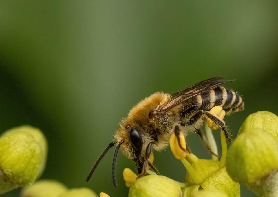 The ivy bee was first recorded in the UK in 2001, and has now been found in much of Southern England and Wales, and in the Channel Islands. As suggested by its common name, Ivy is the main plant used by this bee for pollen. It is seen when ivy is in flower, from early September to early November. Ivy bees nest in loose, light or sandy soil on southern-facing banks and cliffs with ivy nearby for foraging. They are solitary bees, but when conditions are suitable, there may be thousands of nests in the same area.